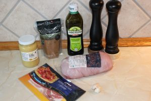 Vi skal bruge et kalkunbryst, brun farin, sennep, bacon, hvidløg, salt og peber og olivenolie.