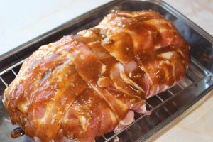 • Pak kødet ind i baconskiverne, læg den på en rist og fordel resten af marinaden ud over