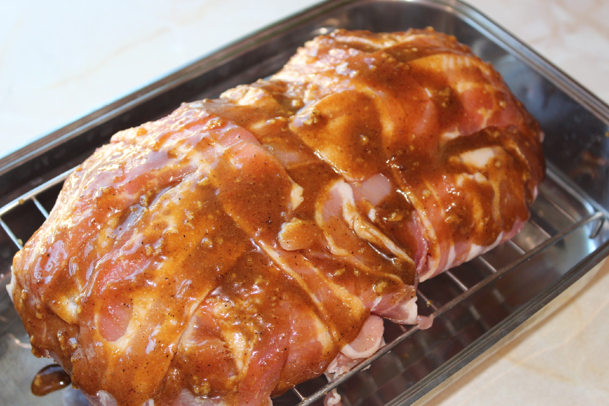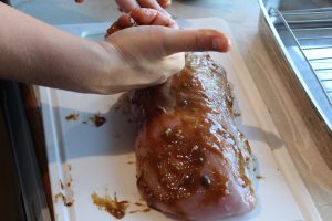 Smør det sidste af marinaden ud over købet og sæt den så i ovnen ved 160 grader i ca. 1½ time, eller indtil et stegetermometer viser en kernetemperatur på 75 grader.