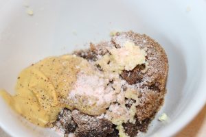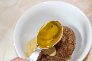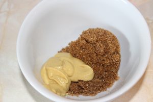 Vi starter med at komme sennep og brun farin (eller lys muscovadosukker) op i en skål.