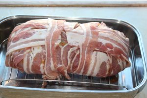 Så kommer det vigtige. Pak kødet godt ind i bacon på alle leder og kanter. Og læg det så på en rist i et ildfast fad, så den ikke ligger ned på bunden af fadet. Vi har vendt risten om, så kødet svæver 1 cm. over bunden.