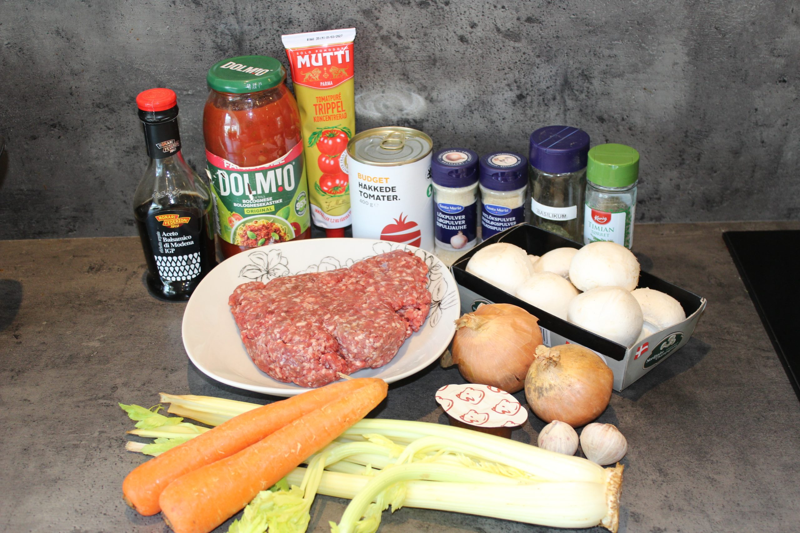 Vi skal bruge oksefars, olivenolie, bladselleri, gulerødder, løg, hvidløg, tørret oregano, tørret basilikum, tørret timian, løgpulver, hvidløgspulver, champignon, balsamico eddike,  oksebouillon, hakkede tomater, pasta sauce, tomatpure, salt og peber og pasta.