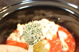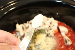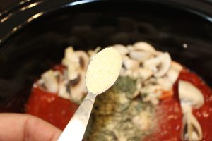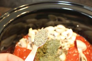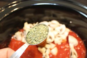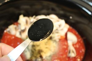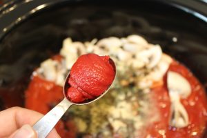 • Samtidig hælder du pasta sauce, hakkede tomater, champignon, oksebouillon, krydderier, balsamico eddike og tomatpure op i slowcookeren