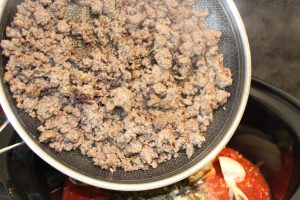 Vores oksekød er nu brunet af, så hæld det op i slowcookeren.