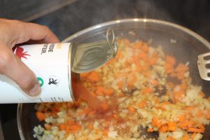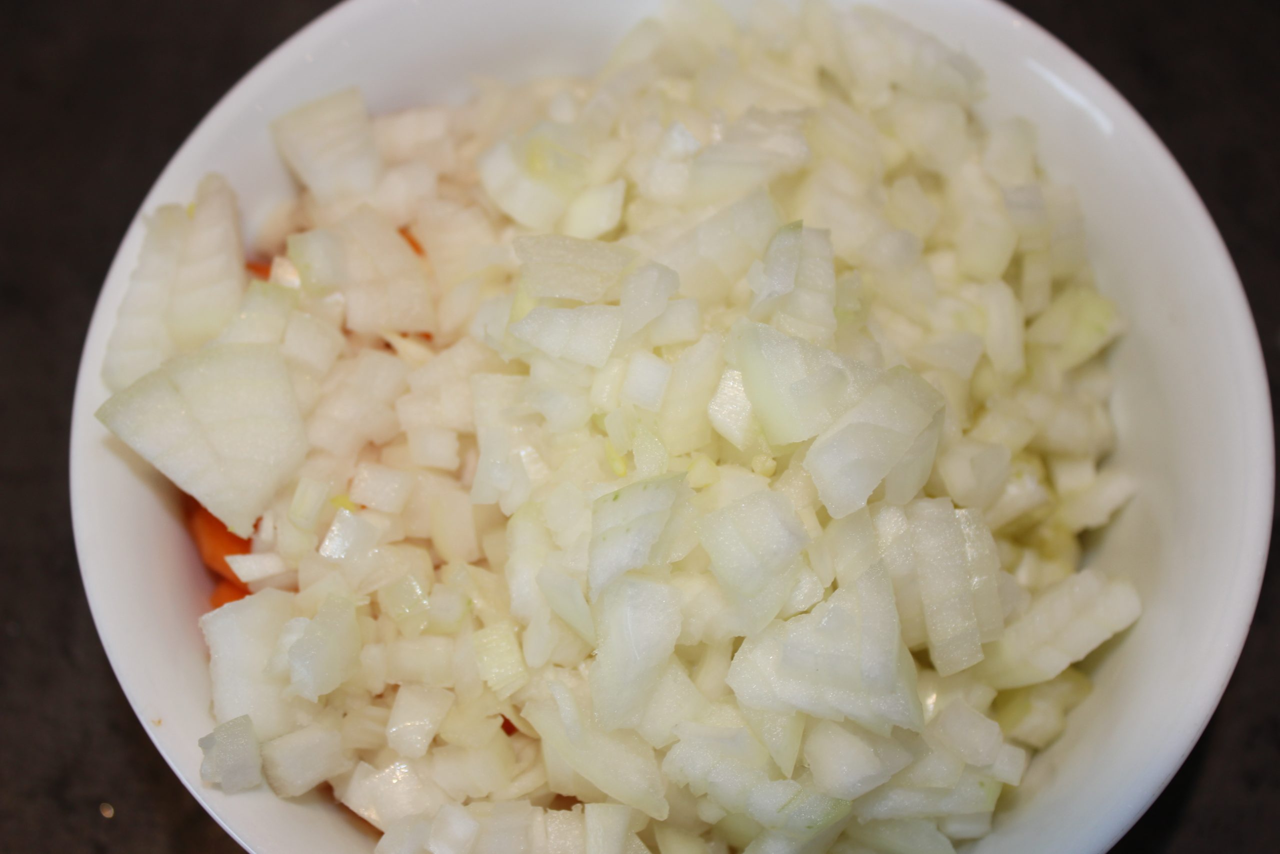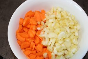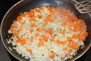 • Vi starter med grøntsagerne: løg, bladselleri og gulerødder skæres i tern