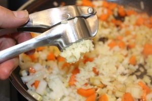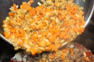 • Kom lidt mere olivenolie på panden og tilføj så løg, gulerødder, bladselleri og presset hvidløg
