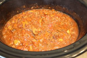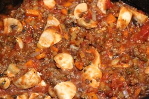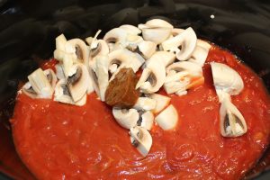 Mens farsen bruner, kommer du pasta sauce, hakkede tomater, champignon og oksebouillon op i slowcookeren.