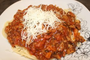 Og så er der serveret, lækker bolognese, pasta og frisk parmesan. Super nem, fyldt med god smag og hvis du er heldig er der rester.